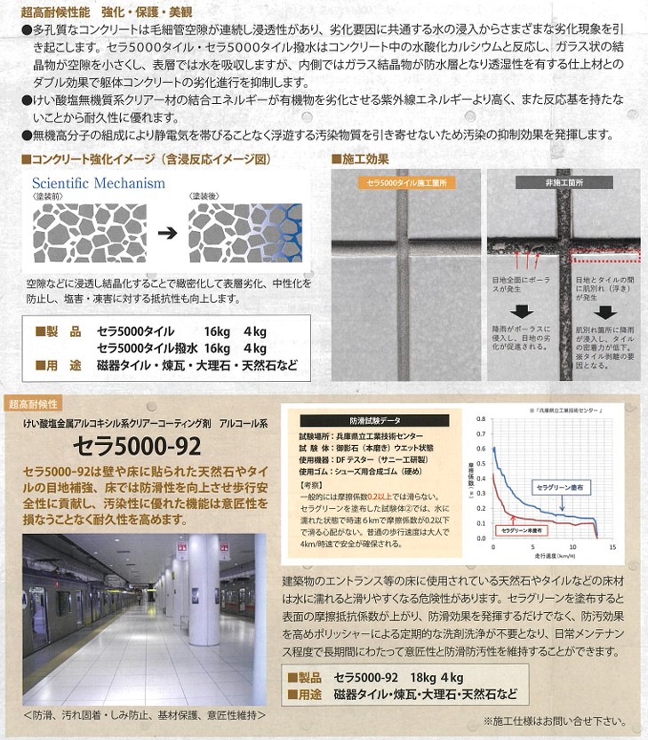 セラ5000タイルは、けい酸塩の反応硬化により、タイル・石材および目地の劣化を抑制し、目地からの水の侵入を防ぐことで、タイルの剥落予防にも効果を発揮します。